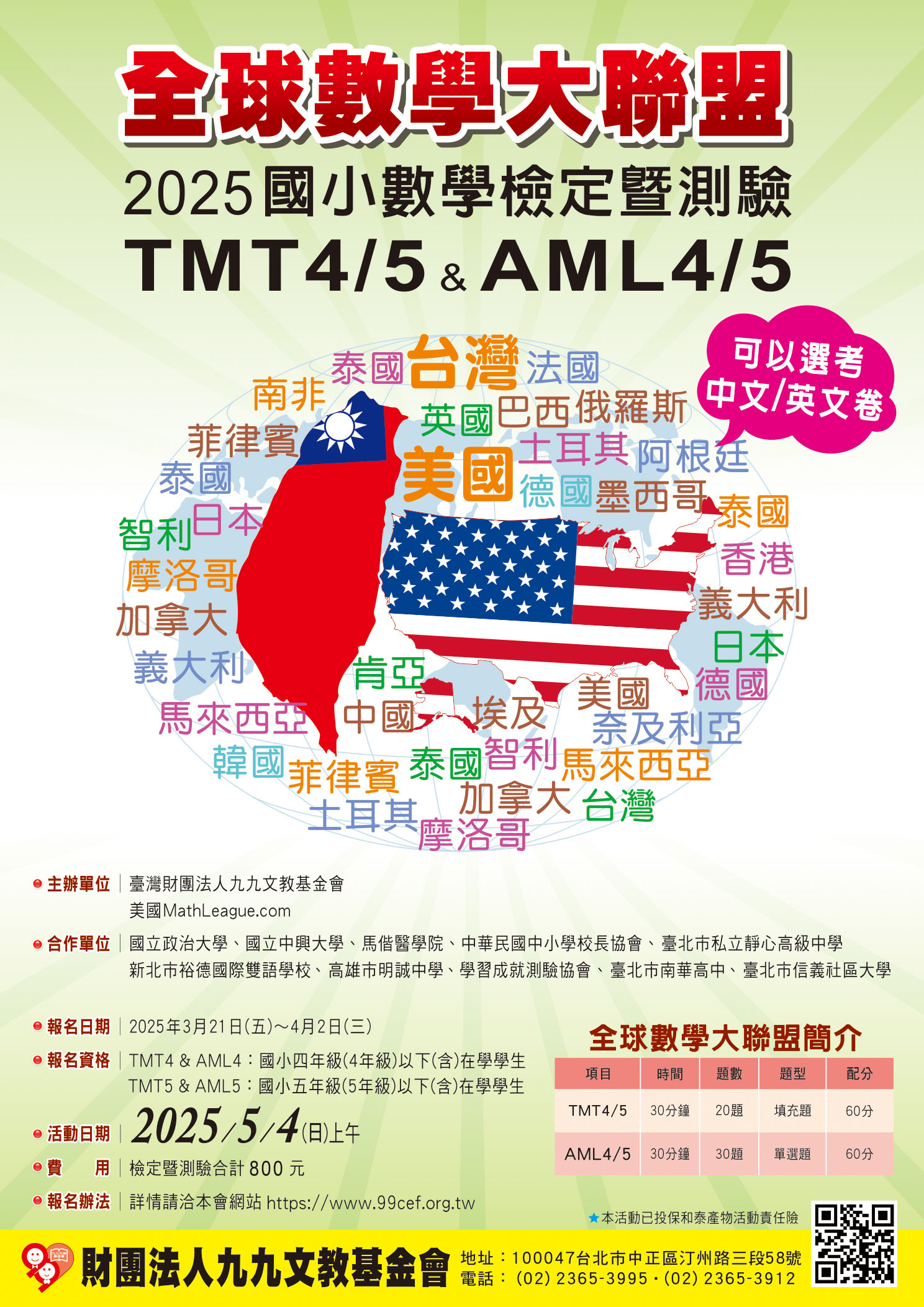 二、報名資格: (一)TMT4 & AML4:全國小學四年級(含)以下在學學生 (二)TMT5 & AML5:全國小學五年級(含)以下在學學生