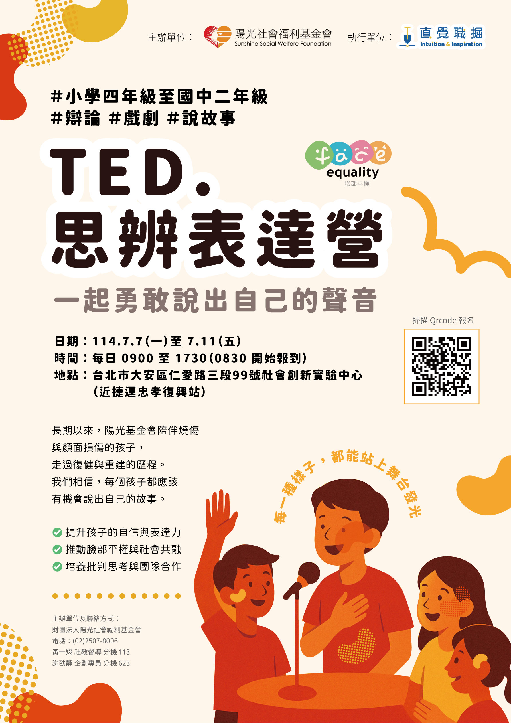 二、為使兒少能更關注日常生活中與自己、與他人相關的事 物,不僅更願意表達,且能自在說出自己的想法,建立其 自信、表達力與同理心,本會攜手「直覺職掘」將於7月份 共同辦理「盛夏OPEN MIND 表達O營」,以思辨訓練結合戲劇教育,透過小組討論、辯論演 練、街訪實作與舞台發表,引導兒少勇敢發聲、理解多 元,並從中認識容貌焦慮與外貌歧視等議題。