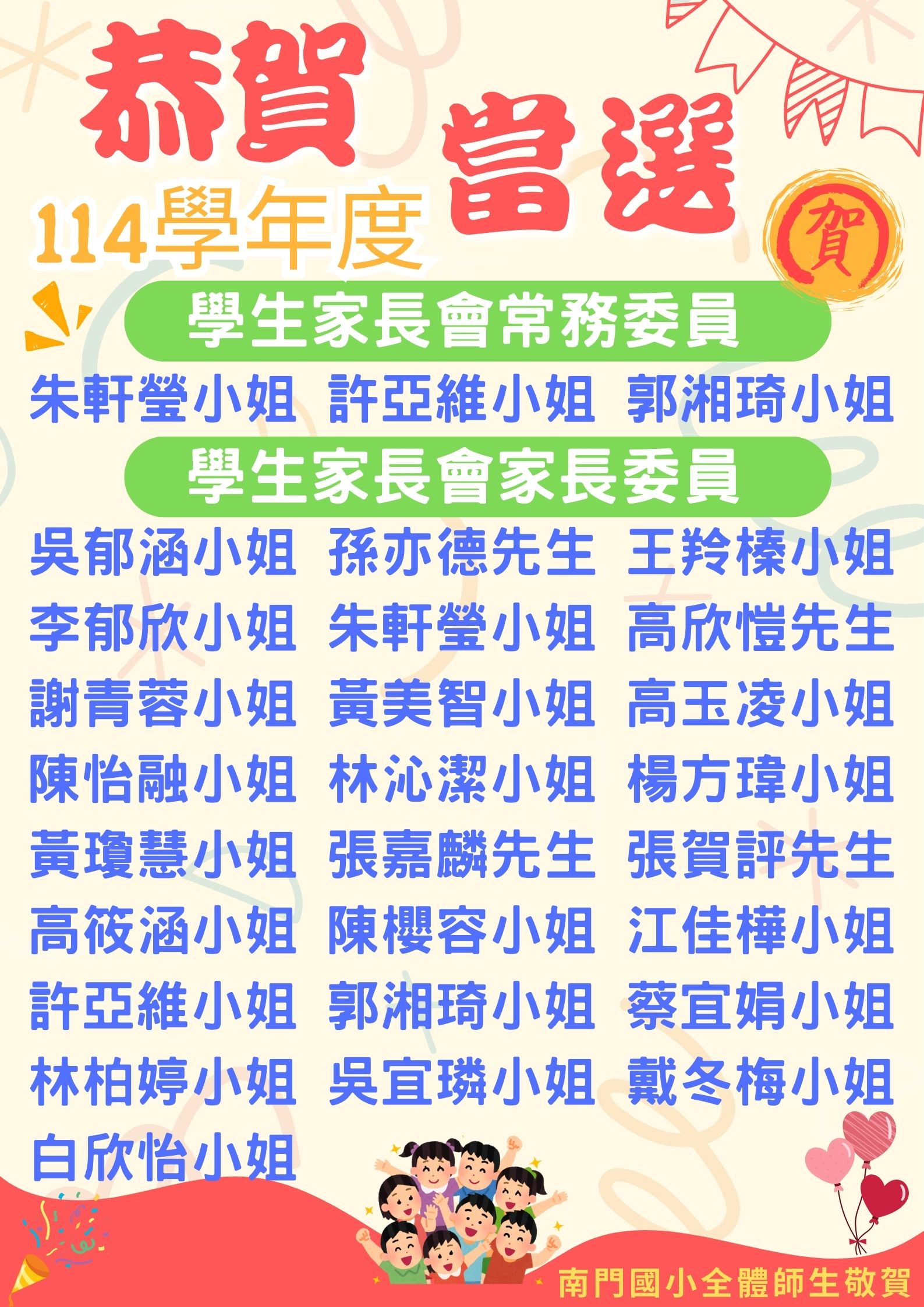 恭賀高欣愷先生當選本校114學年度學生家長會會長!恭賀副會長、常務委員、家長委員當選!(請閱附件)