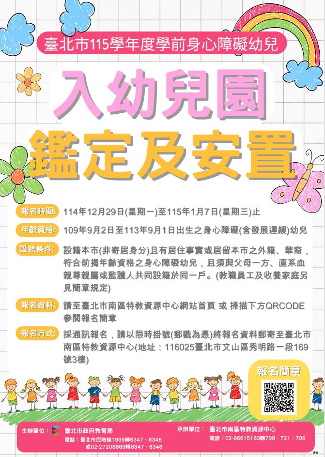 轉知臺北市115學年度學前身心障礙幼兒入幼兒園鑑定及安置簡章如附件