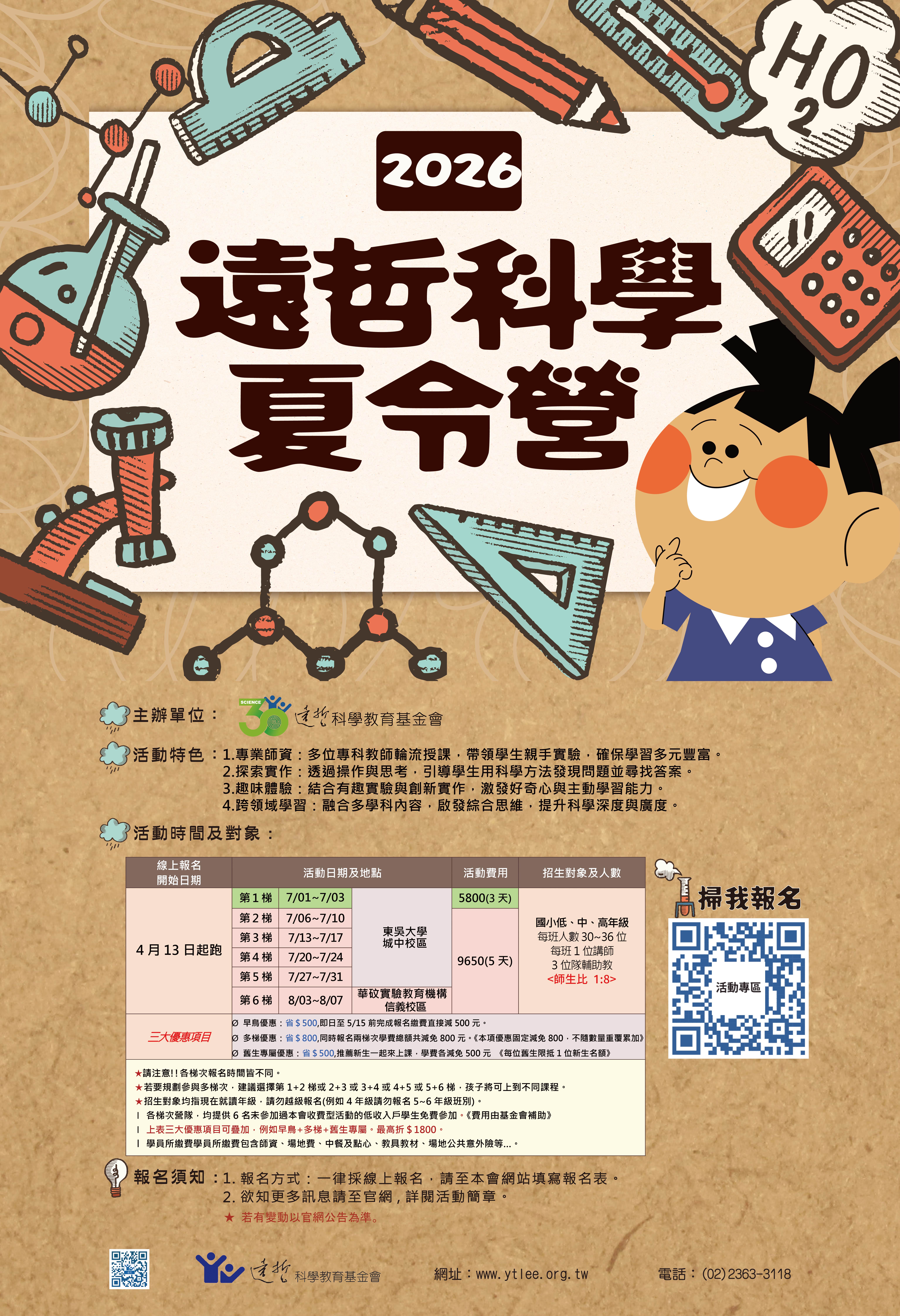 二、活動資訊 活動日期: 民國 115 年 7 月至 8 月(暑假期間)。 活動地點:東吳大學(城中校區): 共五梯 次。華砇實驗教育機構(信義校區): 共 一梯次。 參加對象:國小學生(小學1~6年級)。 報名方式:請至基金會官網:www.ytlee.org.tw